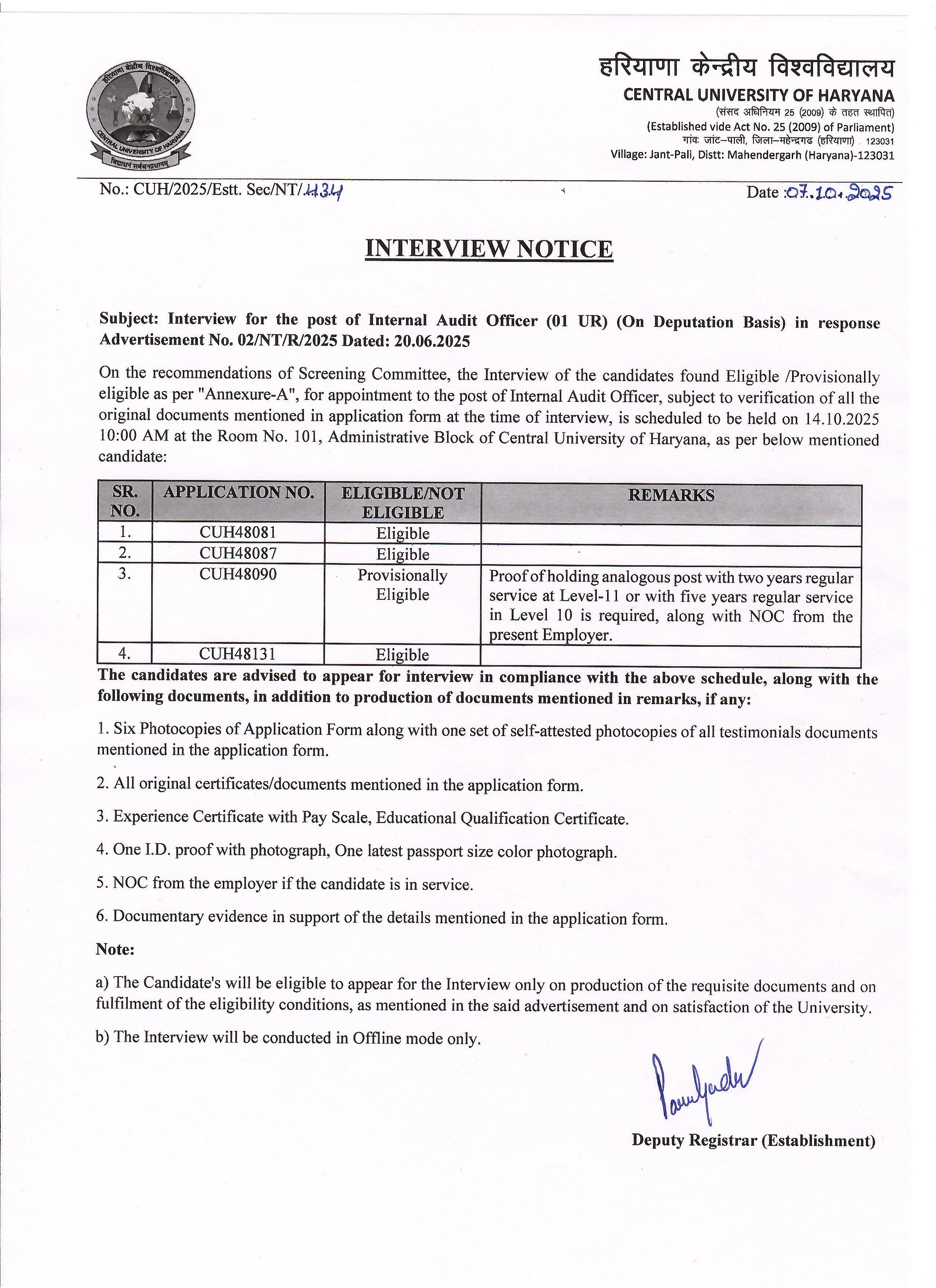 Interview for the post of Deputy Registrar (01 UR, 01 OBC) in response to Advt. No. CUH/01/NT/R/2024 dated 16.02.2024.